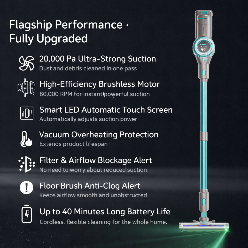 20KPa 250W High-Suction Cordless Stick Vacuum Cleaner with LED Smart Touch Screen