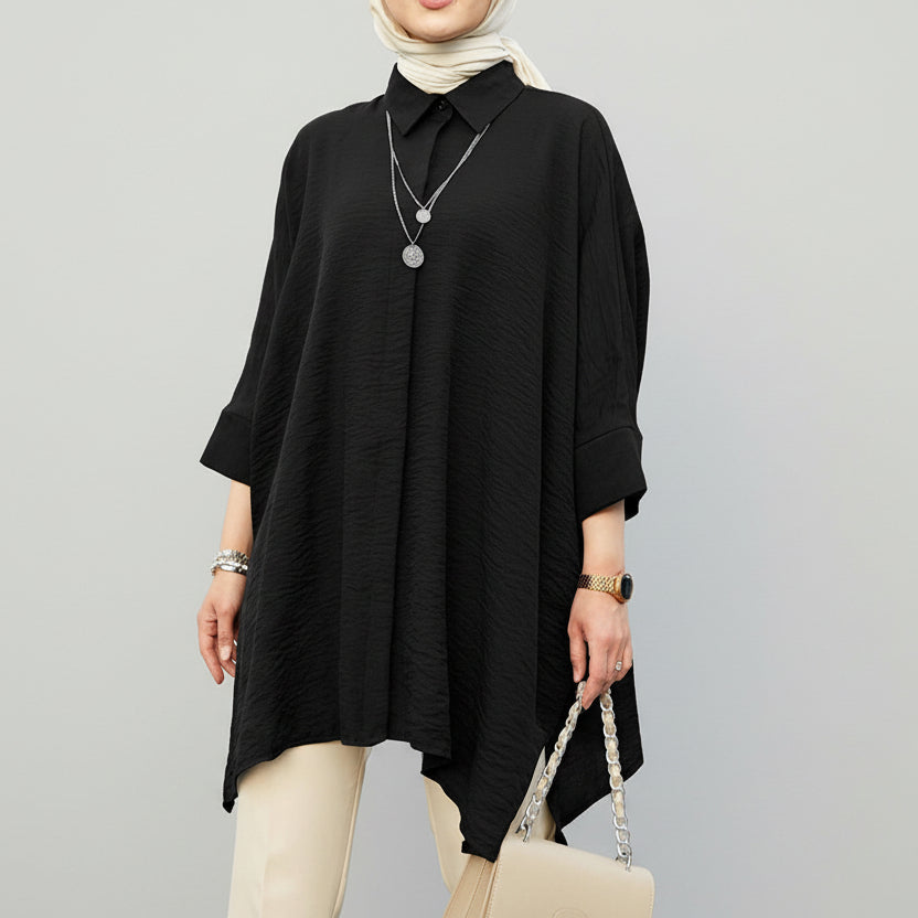 Step into effortless style with this delightfully asymmetrical oversized blouse! Perfect for anyone who loves modest fashion with a twist, this loose-fitting tunic delivers comfort that actually feels luxurious. The standout design showcases a refined turn-down collar, three-quarter sleeves, and a cheeky side-split hem that keeps things fresh and fun. Built from 100% breathable polyester with a non-stretch weave, it provides reliable support and all-day wearability. Whether you're keeping it casual around town, dressing up for holiday gatherings, or just living your best everyday life, this versatile piece is ready to become your new favorite go-to. Simple, comfortable, and undeniably charming!