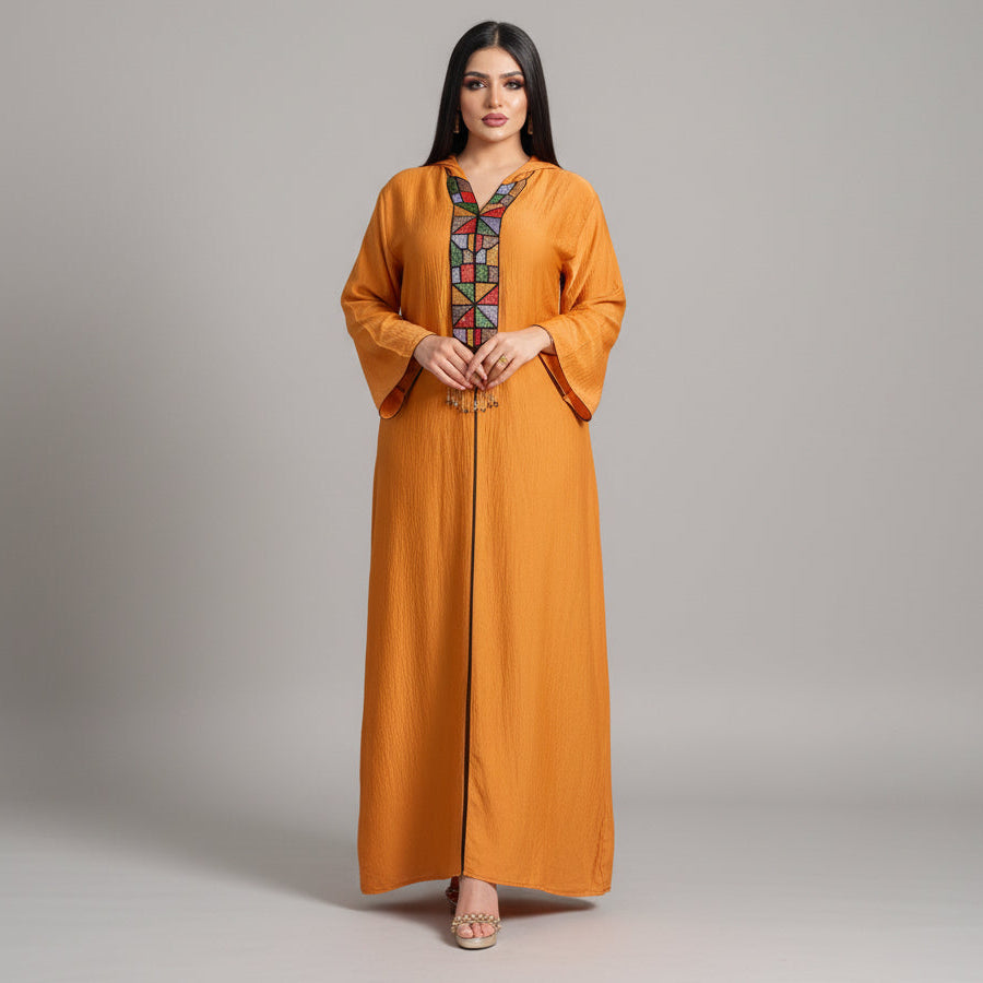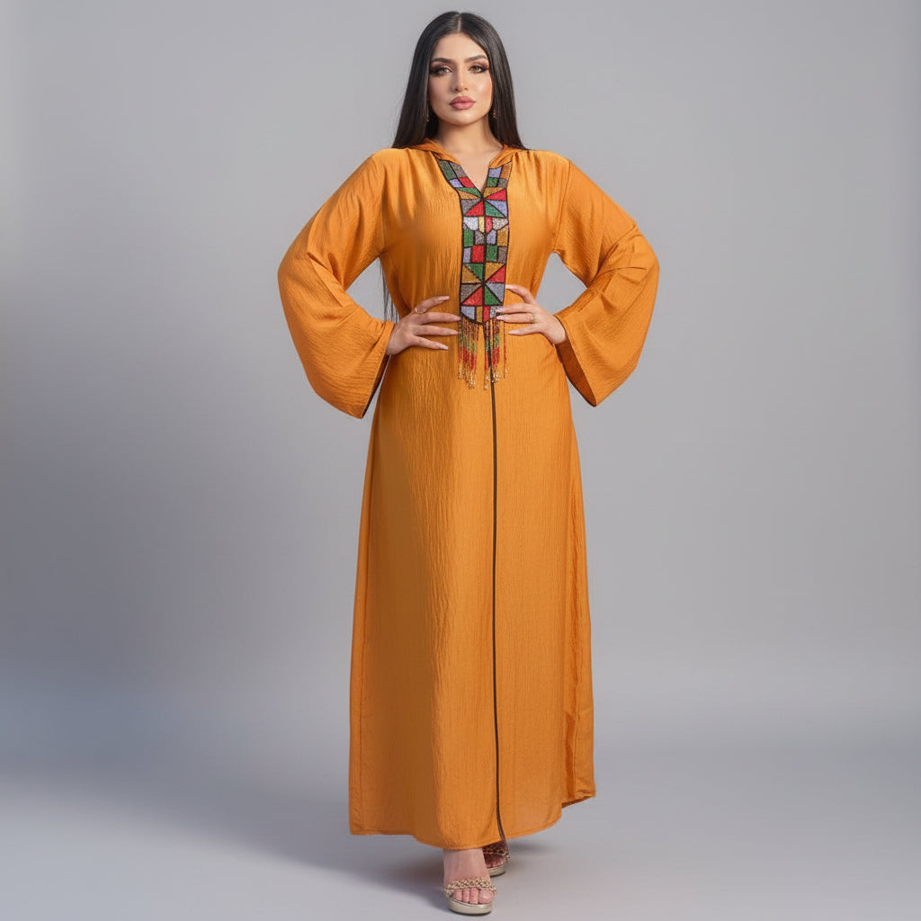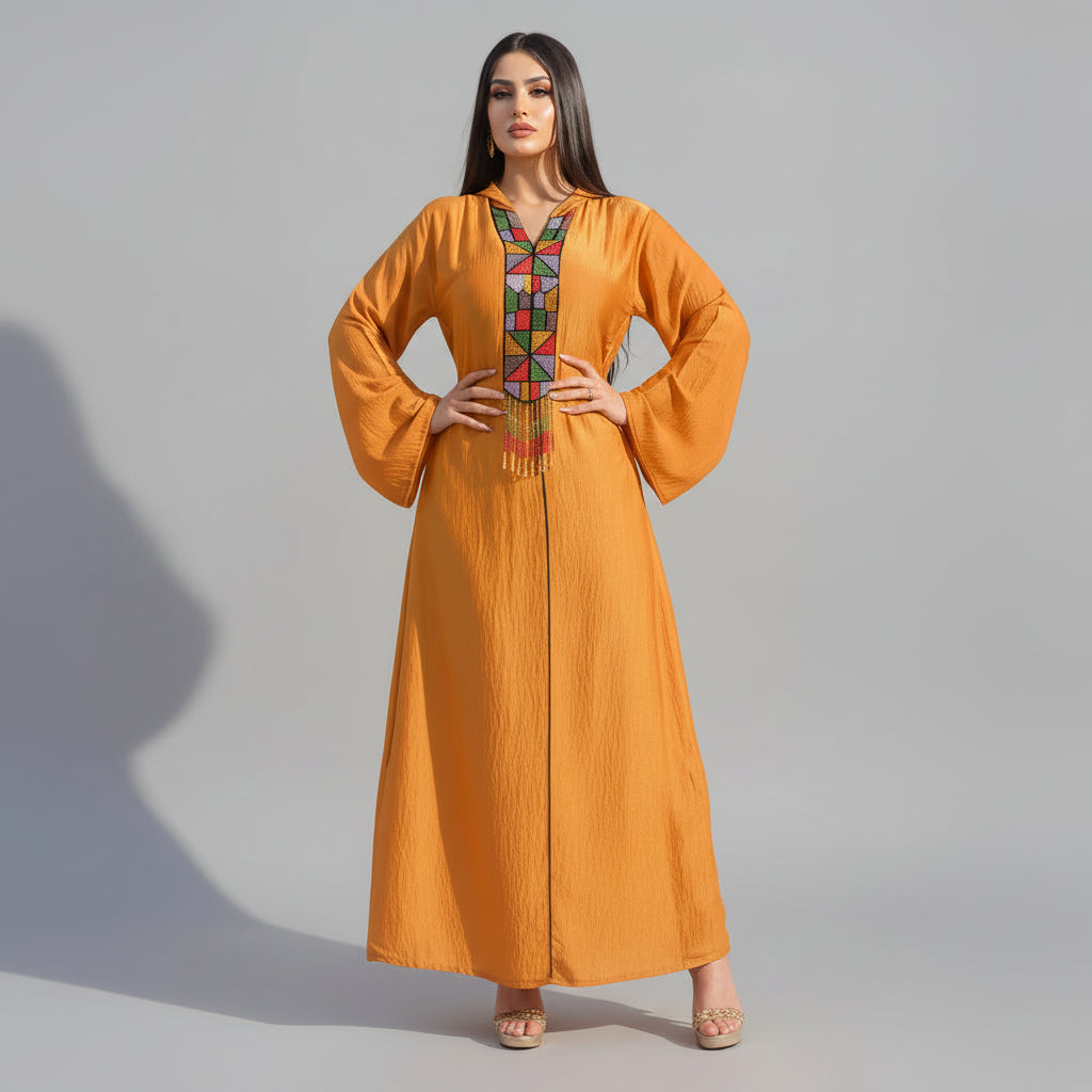 Make a statement in this stunning jalabiya, where vibrant orange fabric meets intricate artistry. Bell sleeves flow gracefully while a richly embellished V-neckline showcases multicolored geometric beadwork, delicate embroidery, and charming hanging tassels that catch the light with every movement. Crafted from breathable, lightweight materials, this maxi dress keeps you cool and comfortable whether you're celebrating at a wedding, honoring cultural traditions, or marking special occasions like Eid and Ramadan. Elegance meets comfort in a dress that's as versatile as it is eye-catching.