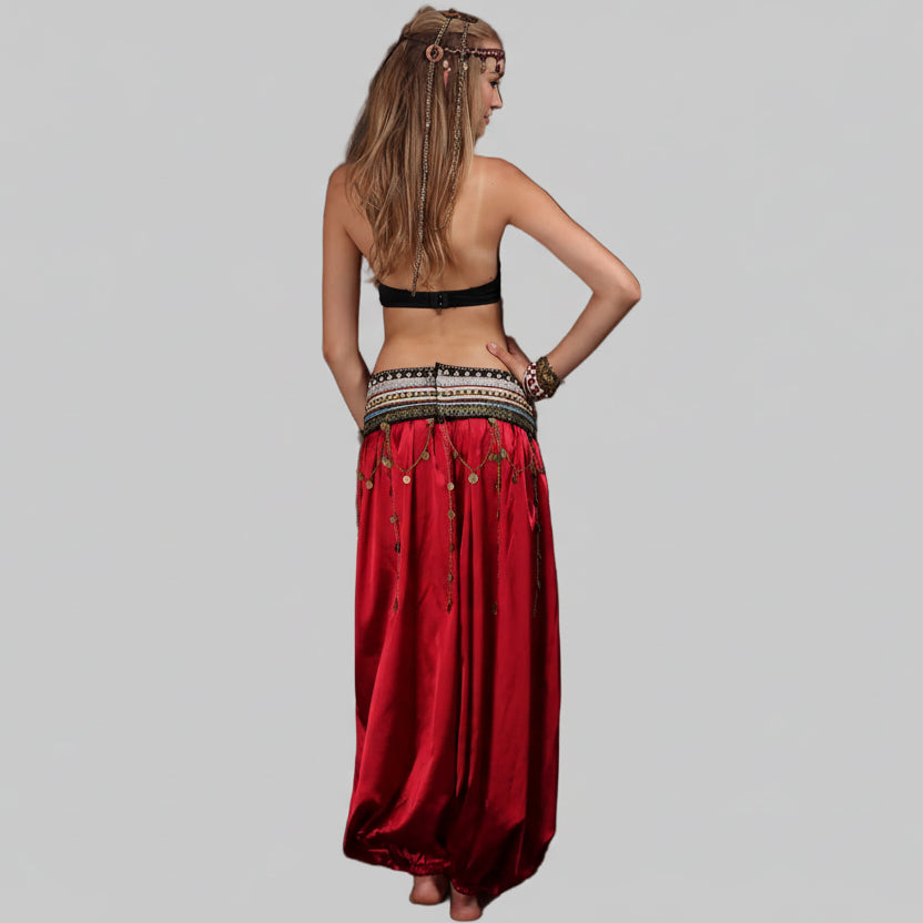 Shimmy and shine in this stunning 3-piece belly dance ensemble that brings authentic flair to any performance or celebration. The set showcases a captivating black and gold sequined bra top accented with turquoise details, paired with a matching embellished hip scarf that catches every light. Flowing red satin harem pants complete the look, featuring dangling coins along the waistband and sides that create mesmerizing jingling sounds with every movement. Crafted from stretchy polyester and spandex blended with eye-catching sequins, beads, and coins, this costume delivers both comfort and showstopping style for dance performances, themed parties, and unforgettable moments.
