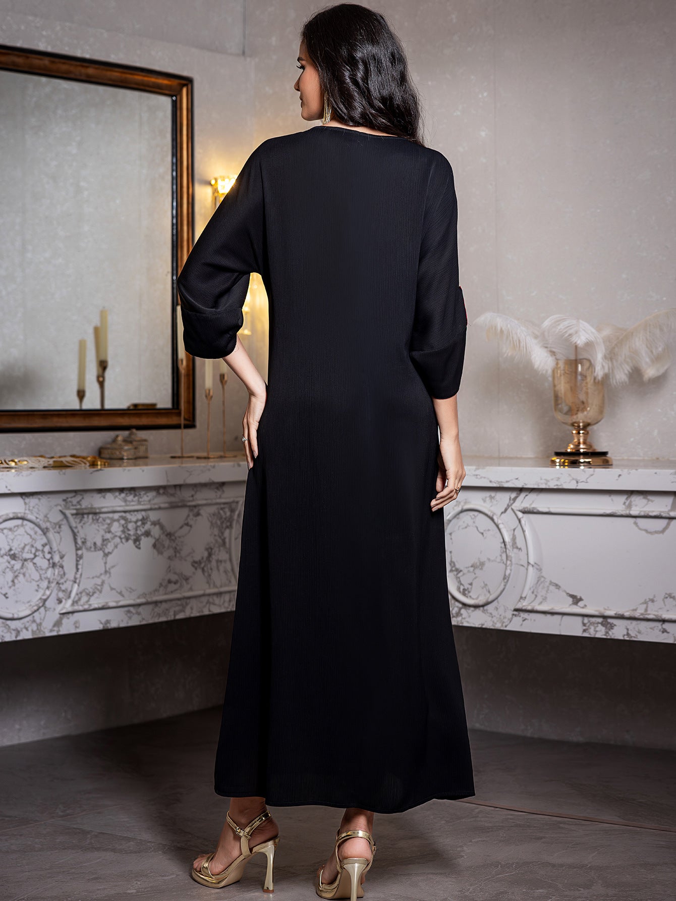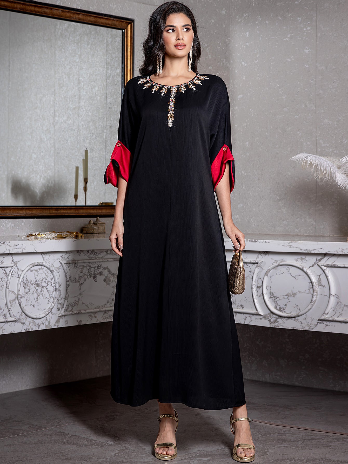Slip into effortless sophistication with this stunning kaftan maxi dress. Draped in luxurious satin, it flows beautifully with every movement while hand-embroidered rhinestone details catch the light in all the right ways. Whether you're heading to a formal gala, evening soirée, or cocktail celebration, this versatile piece delivers glamour. Plus, it's chic enough to wear as an everyday abaya for those who love a touch of sparkle in their daily style.