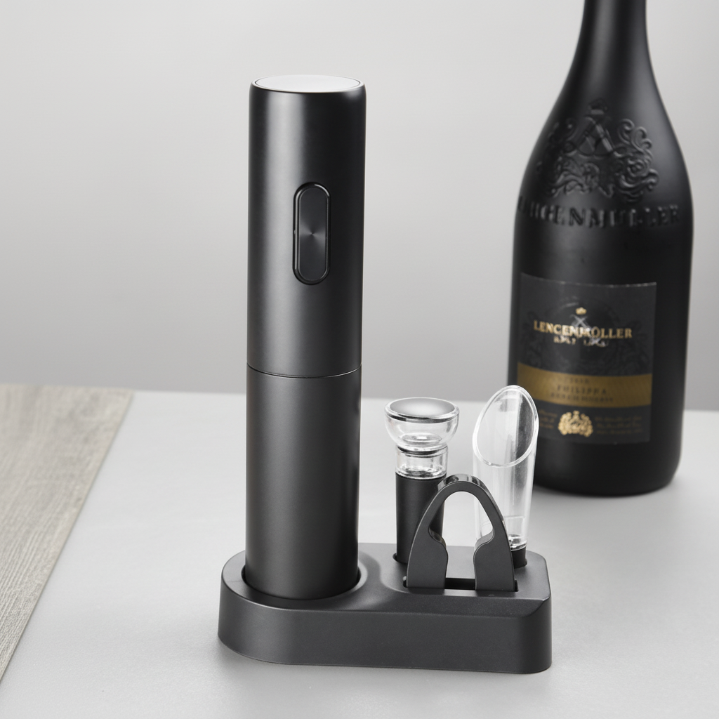 Impress your guests and simplify wine service with this comprehensive 5-in-1 Electric Wine Set. The battery-operated electric opener effortlessly removes corks in seconds, while the integrated pourer ensures smooth, drip-free serving every time. The vacuum stopper preserves opened bottles, keeping wine fresh for days, and the foil cutter handles capsules with precision. Everything stores neatly in the included base, keeping your wine accessories organized and within reach. Perfect for entertaining, everyday enjoyment, or gifting to the wine lover in your life this all-in-one solution transforms wine opening from a chore into a sophisticated experience.