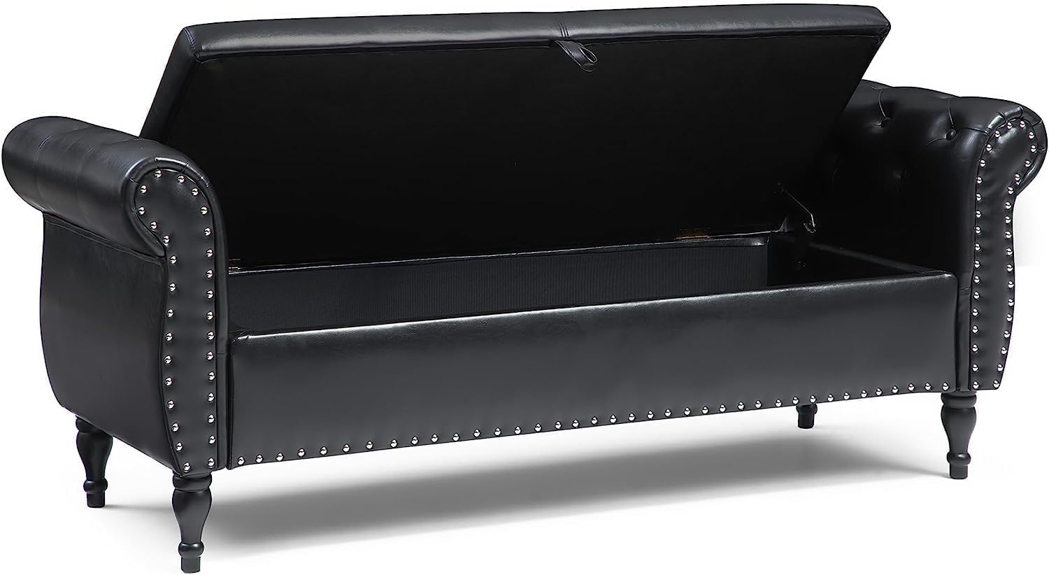This expertly crafted upholstered flip-top storage bench combines elegance and practicality. Featuring rolled arms, refined button-tufted detailing, nailhead trim, and smooth pressure hinges, it enhances any interior setting. Offering ample storage space alongside a comfortable seating option, it serves as a versatile accent for bedrooms, living rooms, or entryways. Position it at the foot of your bed to neatly store blankets, pillows, or toys, place it near a window or fireplace for a relaxing spot, or utilize it as a functional footstool.