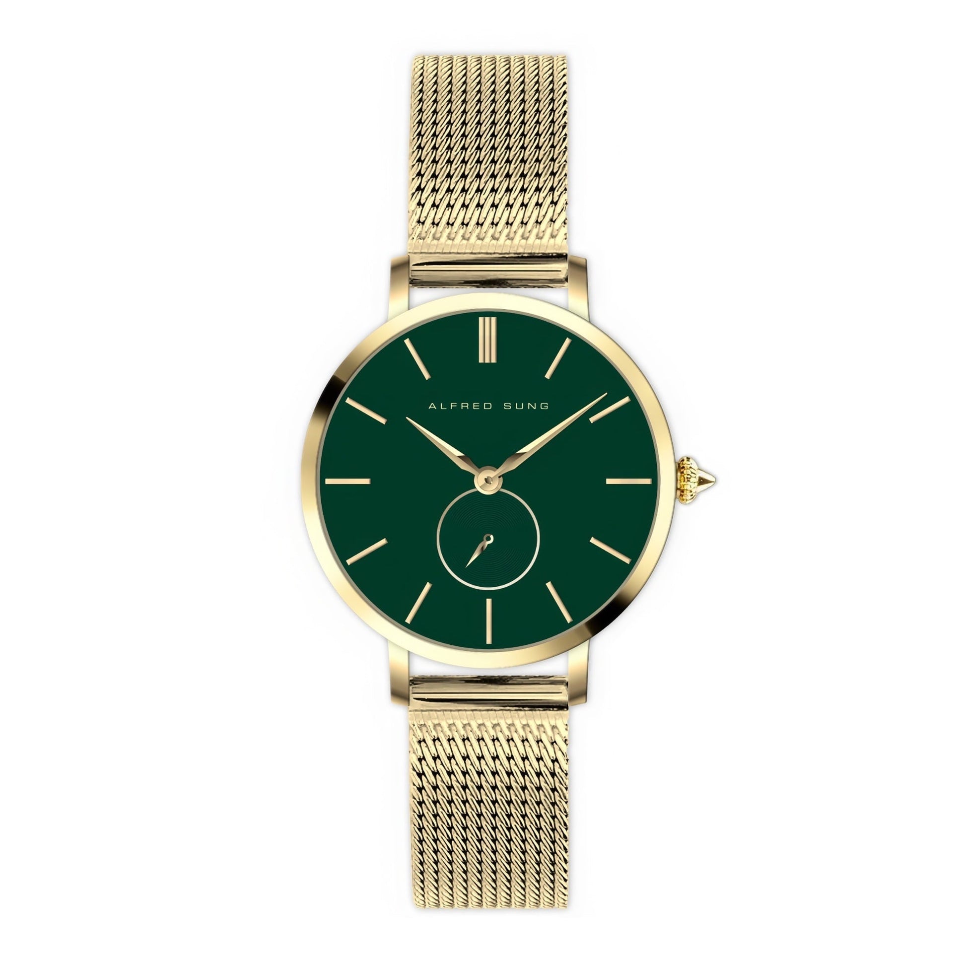 Discover understated luxury with the Alfred Sung Serenity Watch, where timeless design meets modern sensibility. This 33mm timepiece combines a lustrous gold case and matching stainless steel bracelet with a captivating green sunray dial that catches the light beautifully. Powered by reliable Japanese movement and featuring a functional sub-dial, it delivers both style and precision. Whether you're dressing for the boardroom or an evening out, this sophisticated watch elevates any ensemble with its perfect balance of classic refinement and contemporary flair. An investment piece that transcends trends.