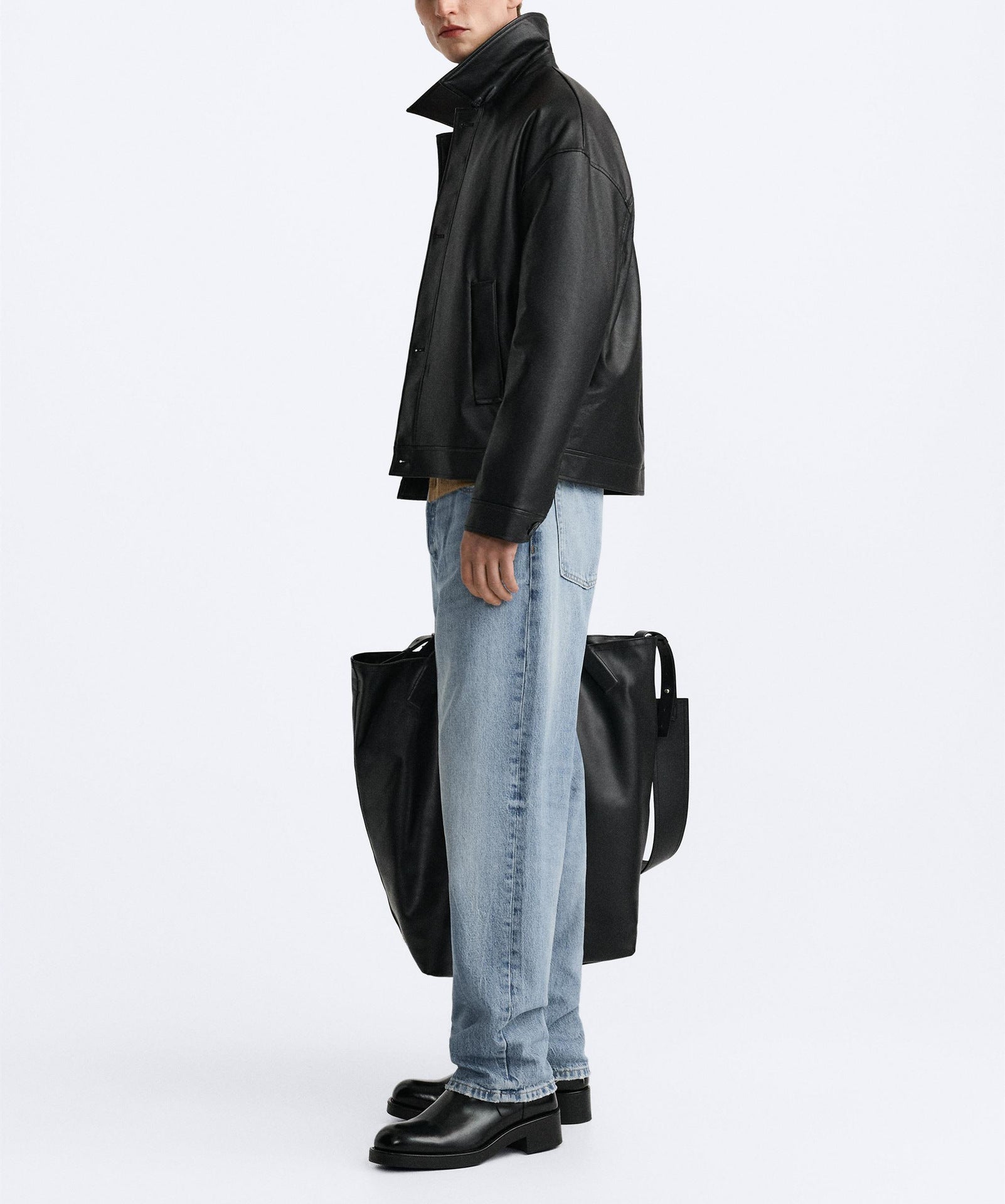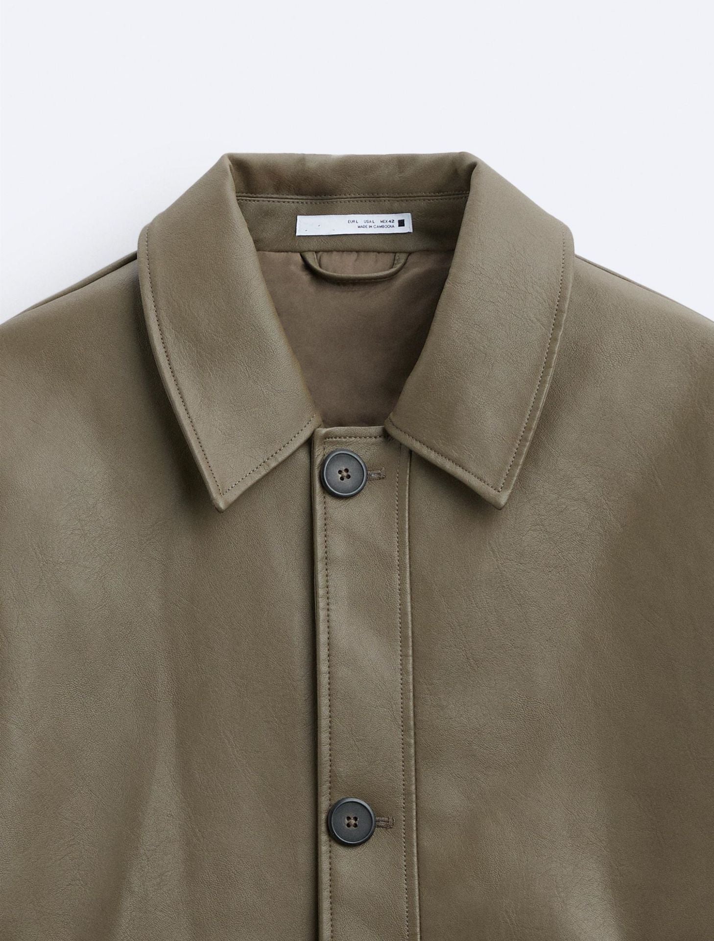 This relaxed, boxy-fit jacket is crafted from high-quality faux leather. It showcases a classic lapel collar and long sleeves finished with buttoned cuffs. The design includes welt pockets on the hips and a detailed interior pocket for added utility. The front closure combines buttons or a hidden zipper, concealed beneath a snap-button placket for a streamlined appearance.