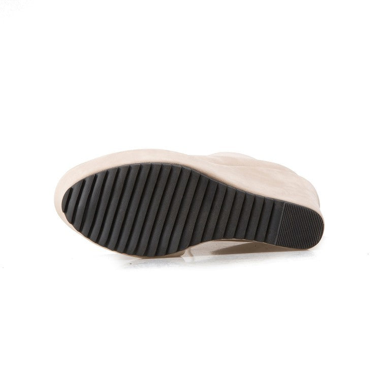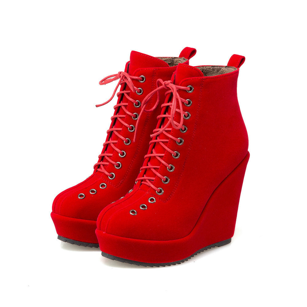 These boots showcase a high wedge heel paired with a platform sole and an ankle-high shaft, secured by a lace-up front for an adjustable fit. The combination of wedge and platform delivers both added height and stability. Crafted for fashionable yet comfortable wear, they are ideal for casual outings in autumn and winter, as well as appropriate for parties or professional settings.