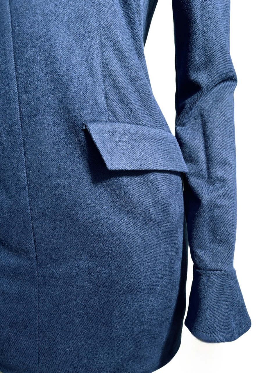 This navy blue, long-sleeved bodycon mini dress features a mock neck and flap pockets, offering a tailored and streamlined fit. The front pockets add a structured, cargo-inspired element that elevates its design beyond a typical bodycon style. Balancing casual and formal elements, this versatile dress is ideal for various occasions, from business casual environments to evening events.