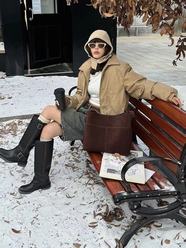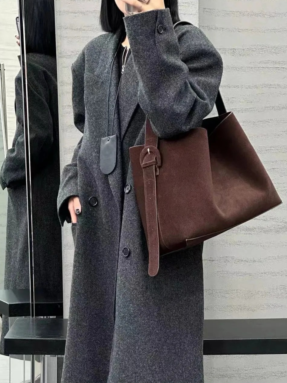 Your search for the ultimate everyday bag ends here. Meet the tote that refuses to compromise between style and substance. This slouchy beauty pairs genuine cow leather with a soft matte suede finish, delivering the sophisticated vintage aesthetic you've been searching for. Its thoughtfully designed belt-buckle shoulder strap adjusts to your preference, while the open-top silhouette with magnetic closure keeps your essentials secure without the fuss. Whether you're commuting with a 14-inch laptop, hauling documents, or managing daily necessities, the generous main compartment handles it all. A dedicated inner pocket protects your phone and wallet from getting lost in the shuffle. This isn't just a bag...it's the practical investment that transforms how you carry yourself through your day.