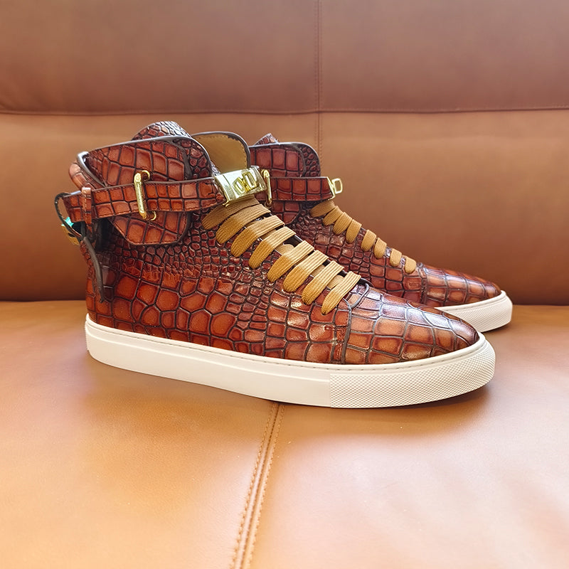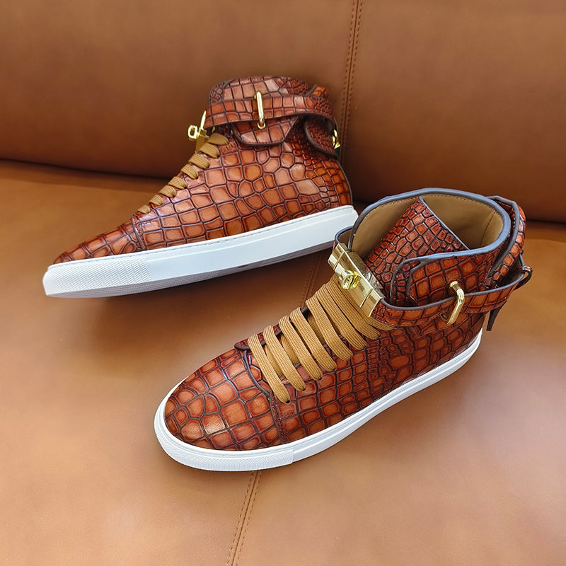 Meet your new go-to high-top: the Sovereign in Apex Coffee. Crafted from genuine cow leather with a bold croc-print finish, this lace-up sneaker brings serious style without taking itself too seriously. The medium heel (1.2–2 inches) keeps things grounded while adding just enough lift to your stride. True-to-size and built for all-day comfort, it's the kind of shoe that works as hard as you do, whether you're conquering the streets or just looking effortlessly cool.