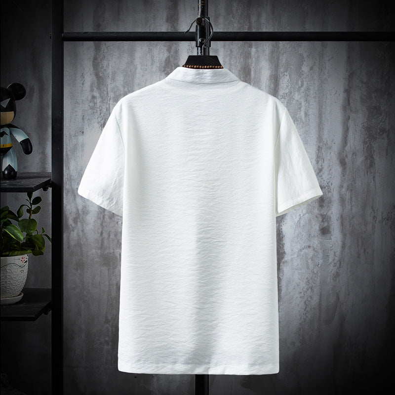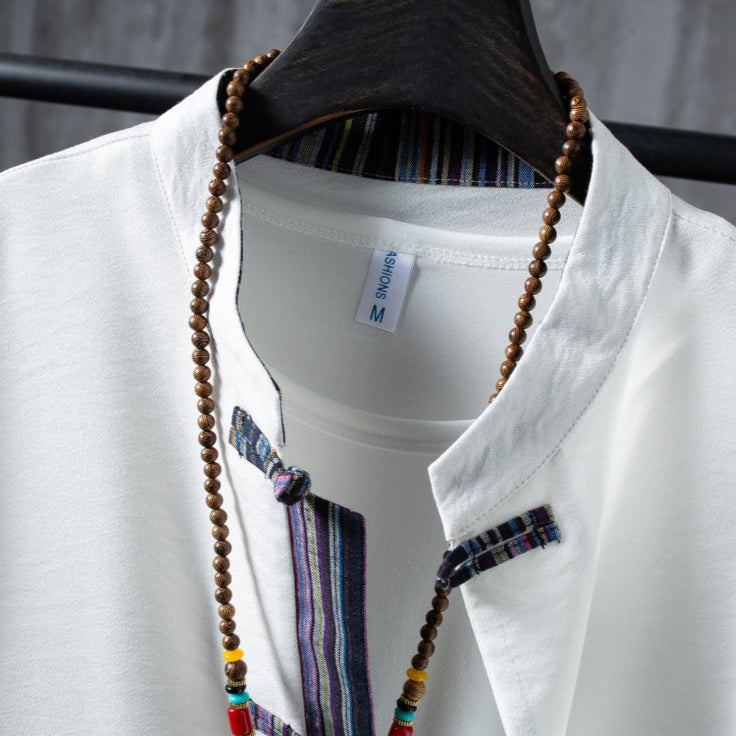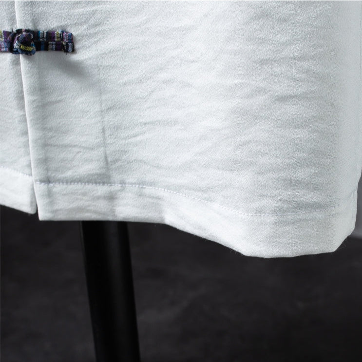 This two-piece set, crafted from a cotton and linen blend, includes a short-sleeve shirt with a stand-up Mandarin collar and coordinating drawstring pants. The breathable fabric ensures comfort in warm conditions, while the design channels a relaxed Chinese-inspired look, reminiscent of traditional Tai Chi suits known for their simplicity and ease of wear.