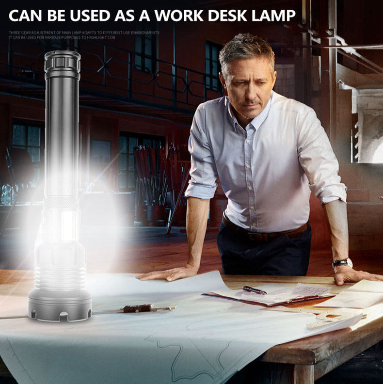 This rechargeable flashlight delivers 10,000 lumens with three main modes plus additional side light options, including red light settings. Its zoom function adjusts between focused and wide beams. Built from durable aluminum with water resistance, it suits indoor and outdoor use like camping and hiking. Featuring USB charging and battery level indicators, it also works as a power bank, making it a dependable tool for emergencies and daily tasks.